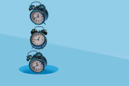 Alarm clock falling into a hole on pastel blue background. Creative time concept. Minimal abstract composition.