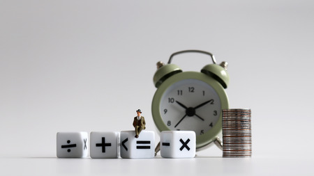 A miniature man sitting on a die with an arithmetic operation symbol in front of the alarm clock.