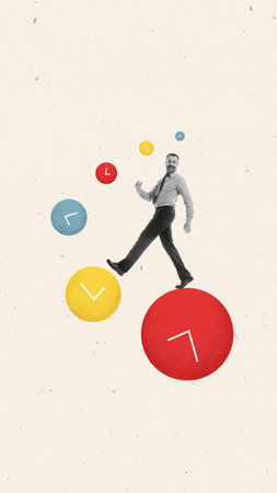 Contemporary art collage. Successful businessman walks merrily on multicolored clock. Burning deadlines. Concept of business, economy, career growth, strategy, finance, life-work balance