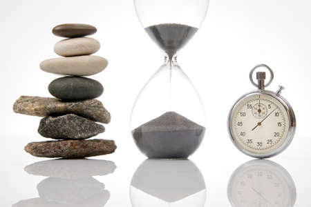 pyramid of stones in balance and a mechanical stopwatch on a white background. Time part precision. Measuring the speed interval with a watch