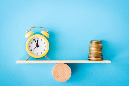 Time is money, Business concept. Blue background, scales with clock and stack of coins, copy space