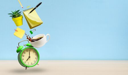 Fun Office accessories flying over desk table on blue wall background. Free space