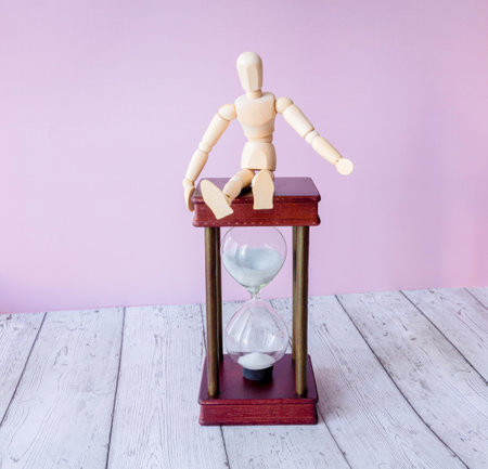 Waiting time, time to think concept. Wooden human figure sit next to sand glass. Copy space for text