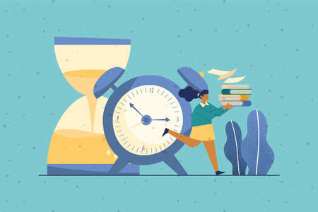 Miniature people toy figure photography. End and start of school concept. Young girl pupil running above white clock isolated on blue background. Image photo