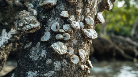 Close up of oyster shells texture on rocky surface: natural patterns and marine life details.