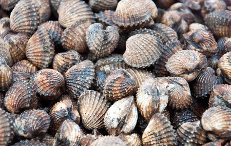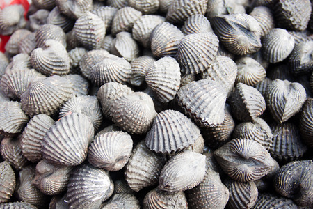 Fresh cockle in the market.cockles seafood, pile of​ fresh blood cockles top view, cockles or scallop fresh raw shellfish