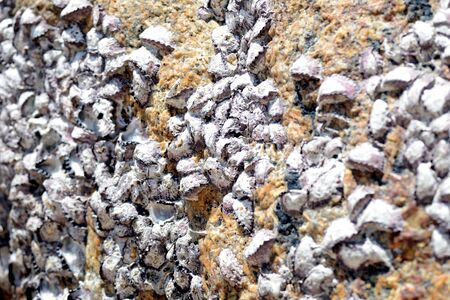 Sea mollusks Semibalanus balanoides on the littoral of the White Sea at low tide. View of the limestone houses of crustaceans from above.