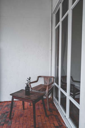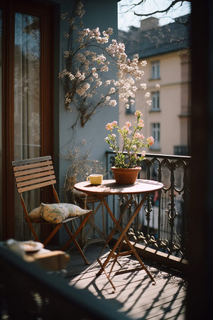 A charming balcony setup featuring rustic wooden furniture, vibrant potted plants, and soft natural light creating a serene escape in an urban environment.