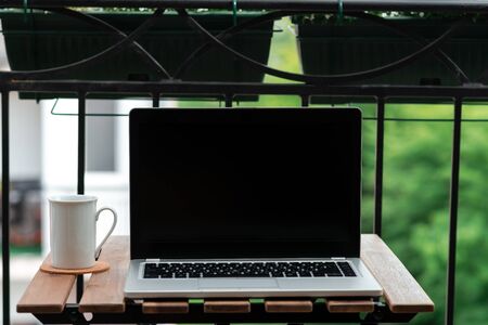Work on fresh air. Morning at balcony. Work from home. Remote learning
