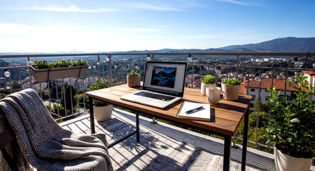 An outdoor balcony workspace display showcasing a portable laptop on a wooden table with overwhelming greenery and a light breeze creating an inspiring atmosphere