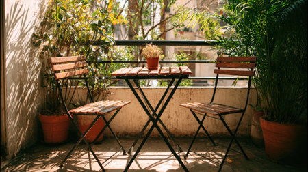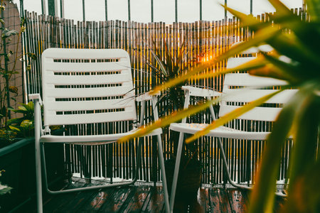 Cozy urban balcony with two chairs and potted plants at sunset. That the image is generated using AI.