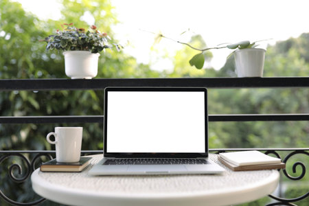 Laptop with coffee cup and plant pots with notebooks on metal table at balcony outdoor