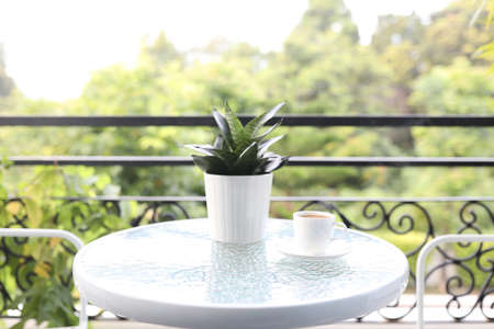 Hahnii small snake plant and white coffee cup on glass table outdoor balcony