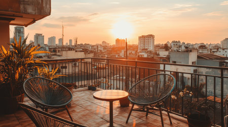 A breathtaking sunset view from a rooftop terrace. Includes a coffee cup, plants, and a cityscape. The warm, golden light creates a perfect ambiance.