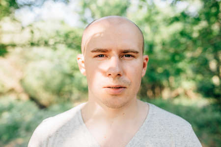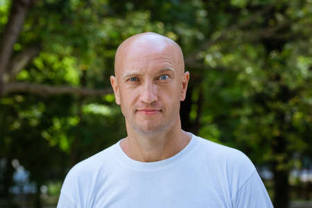 portrait of a bald man in a white T-shirt on the background of the park, mimicry raised eyebrow