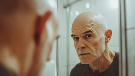 Worried Bald Man Examining His Scalp in the Mirror. High quality photo