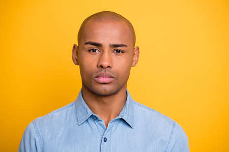 Photo of dark skin macho not smiling moody wear jeans denim shirt isolated bright yellow background