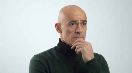Bald man with a beard in turtleneck sweater, no expression