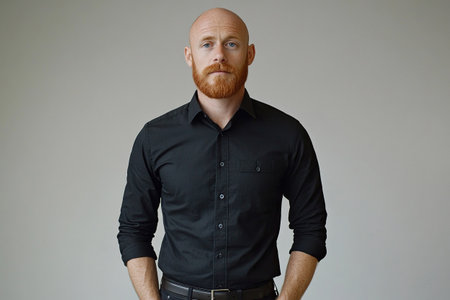 A photograph of a middle-aged man with a bald head and a short red beard, wearing a black shirt. Generated by artificial intelligence