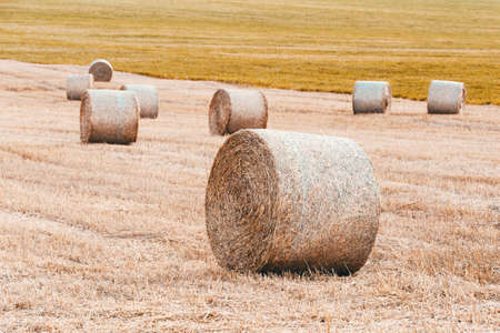 Beautiful landscape of agricultural wheat field - Round bundles of dry grass in the field,bales of hay
