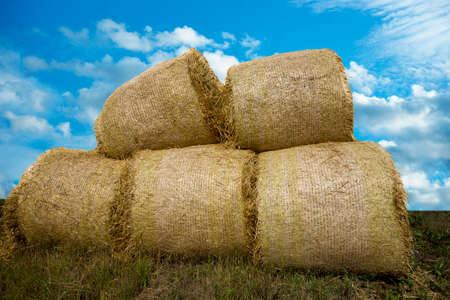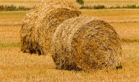 Bright yellow dry Rolls of haystacks on the summer field. Rural landscapes