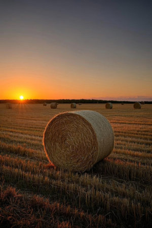 A tranquil countryside landscape features round hay bales resting in a golden field. The sun sets, casting warm light and shadows across the landscape, creating a serene atmosphere.