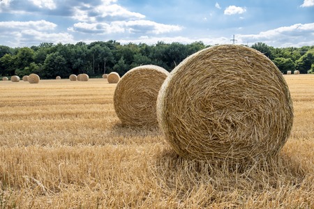 Round bales of straw on farmland a cloudy sky. Mowed field after harvesting wheat.