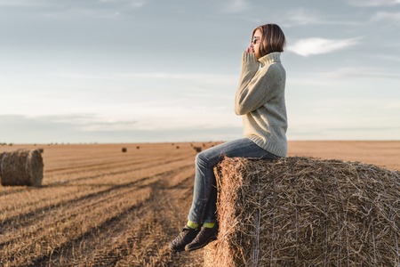 Silhouette of pretty young woman with long hair wearing shorts, t-shirt and white sneakers sitting on a hay bale in summer stubble field in sunset background.