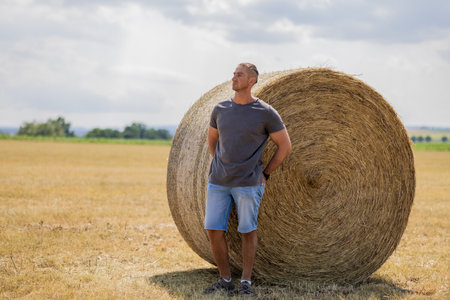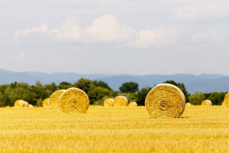 harvested field with straw bales with evening sun, summer agriculture concept, czech republic
