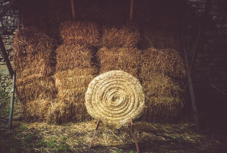 Harvesting in agriculture bales of hay are stacked in large stacks