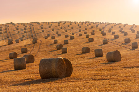 Rolls of haystacks on the field. Summer farm scenery with haystack on the Background of beautiful sunset. Agriculture Concept.