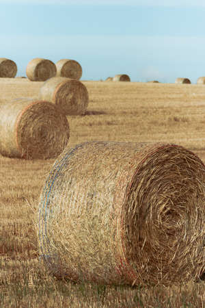 Beautiful landscape of agricultural wheat field - Round bundles of dry grass in the field,bales of hay