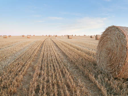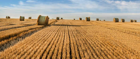Haystacks straw left after harvesting wheat, Field Landscape with Rolls and Sky, Agriculture Concept