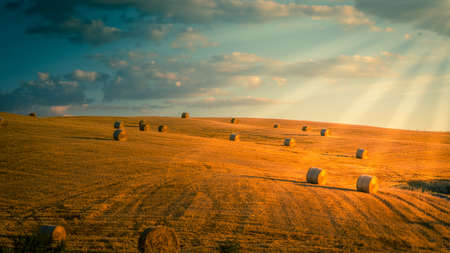 Beautiful landscape of agricultural wheat field - Round bundles of dry grass in the field,bales of hay