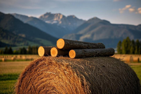 Hay bales and logs in the mountain meadows