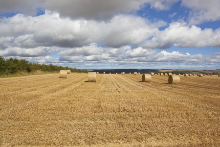 a scenic agricultural landscape with large round straw bales in a golden stubble field with rolling hills under a blue cloudy sky in late summer