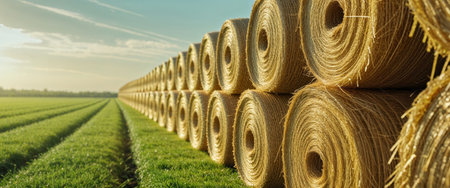 AI Generated. Bales of hay arranged in rows on a farm field illuminated by warm sunlight during late afternoon hours