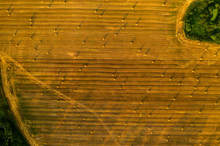 Aerial view crop wheat rolls of straw in field. Landscape view from above taken from a drone after wheat harvested. Agriculture farm rural aerial, bread production concept