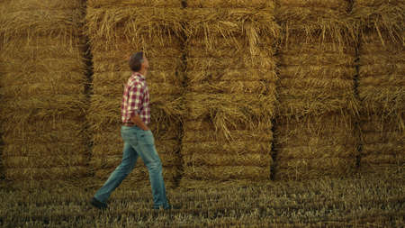 Farmer walking hay stack at agricultural farmland. Worker inspecting rolls pile at countryside. Agribusiness owner manager going check haystack after autumn harvesting season. Rural lifestyle concept