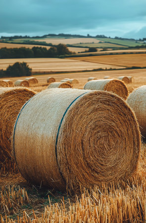 A picturesque view of golden hay bales in an expansive agricultural field, surrounded by rolling hills and a moody sky, perfect for capturing rural beauty and serenity.