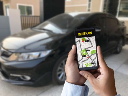 Person holding a smartphone while waiting for his driver and looking at the navigation map on the ride share app