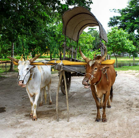 TAMIL NADU, INDIA - SEPTEMBER 12, 2009: Unidentified indian man on cart with yoke of oxen. Cartage is still a common means of transport in India especially in rural areas