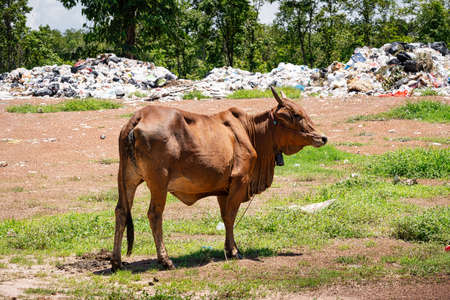 Cow Grazes On Landfill, landscape with cattle at garbage dump