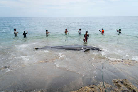 LAMALERA, NUSA TENGGARA, INDONESIA - DEC 13, 2018: Locals playing with the captured pilot whale near the shore while others are fishing at Lamalera Indonesia