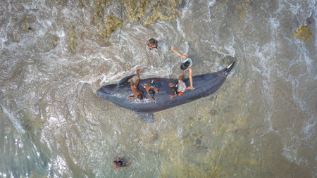 LAMALERA, NUSA TENGGARA, INDONESIA - DEC 13, 2018: Little kids playing with the captured pilot whale near the shore while others are fishing at Lamalera Indonesia