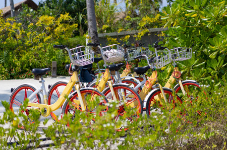 Seville Spain July 01, 2021 Accessible bicycles to hire for short periods of time, usually for a few hours parked in the street and part of the public transport system of Seville