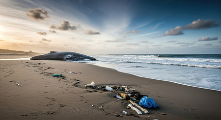 Beached whale lying motionless on empty sandy shore with scattered plastic bottles and trash in foreground, haunting scene illustrating ocean pollution, marine ecosystem collapse environmental crisis