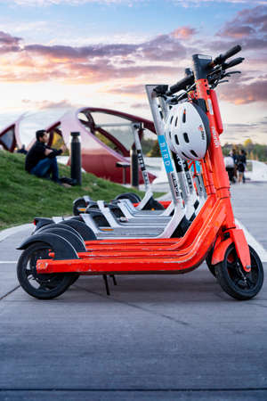Calgary Alberta Canada, May 22 2022: Electric scooters for rent parked in a designated parking spot along a downtown bike path near the Santiago Peace Bridge.