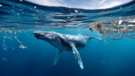 Plastic pollution in the ocean is an environmental problem. Whales swim among plastic waste in the ocean. A global problem, a threat to ocean wildlife and calling for urgent action to protect the environment