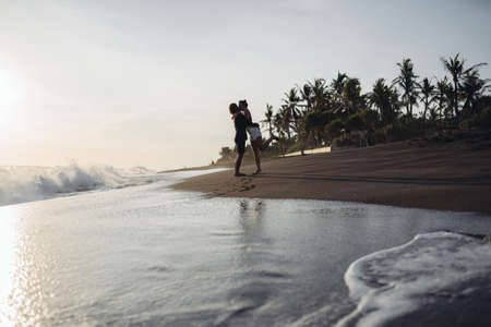 The beautiful waters of the calm ocean touch the sandy shore with palm trees on which stands a man and a woman kissing in the distance. High quality photo